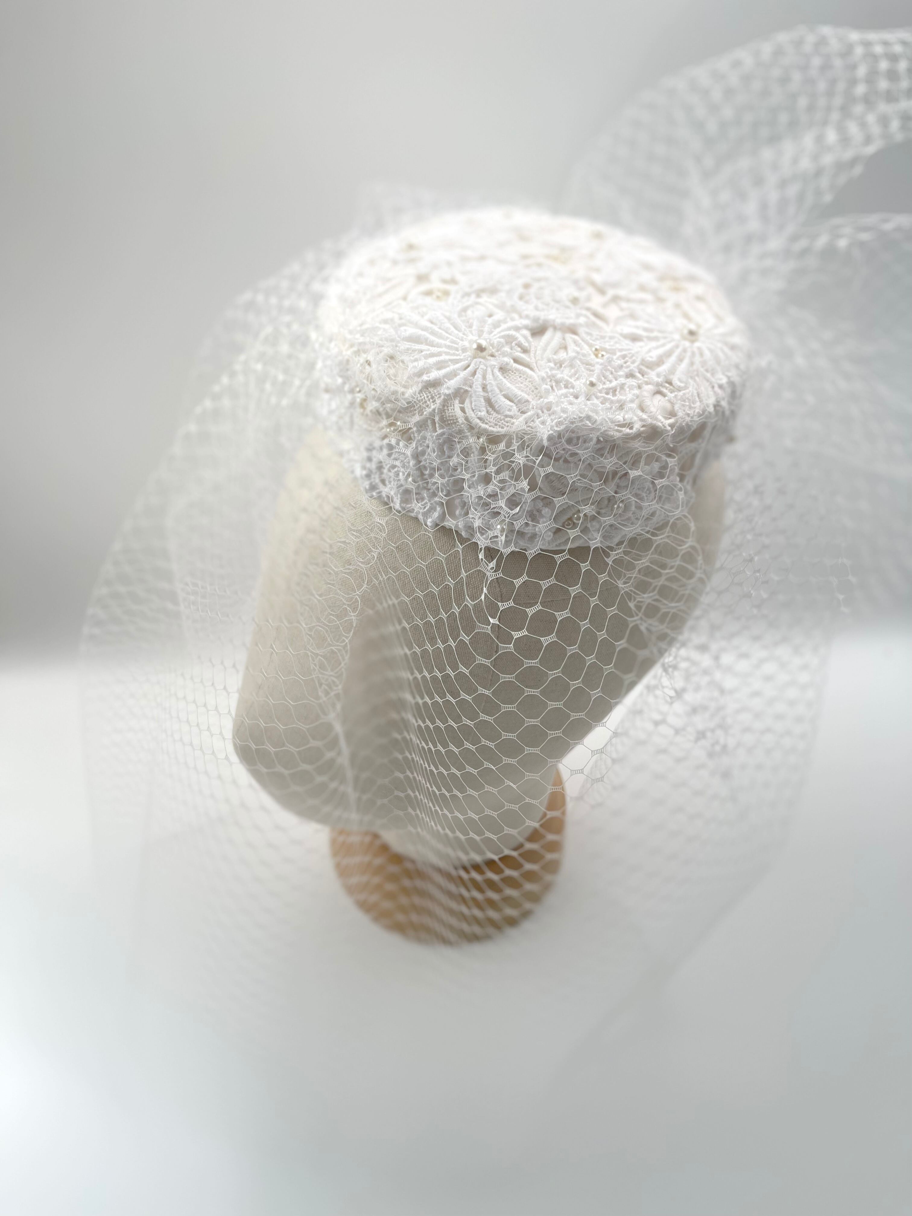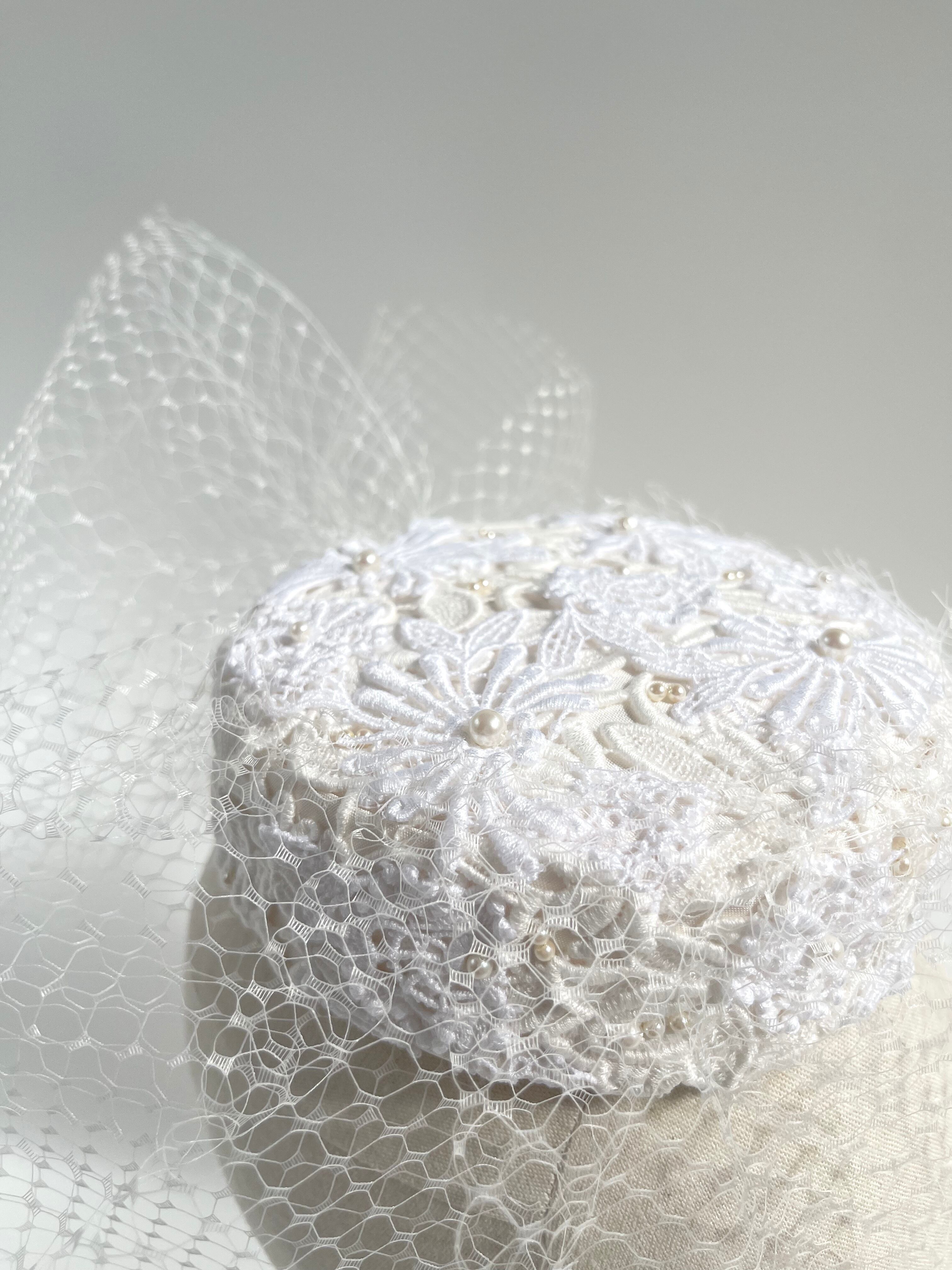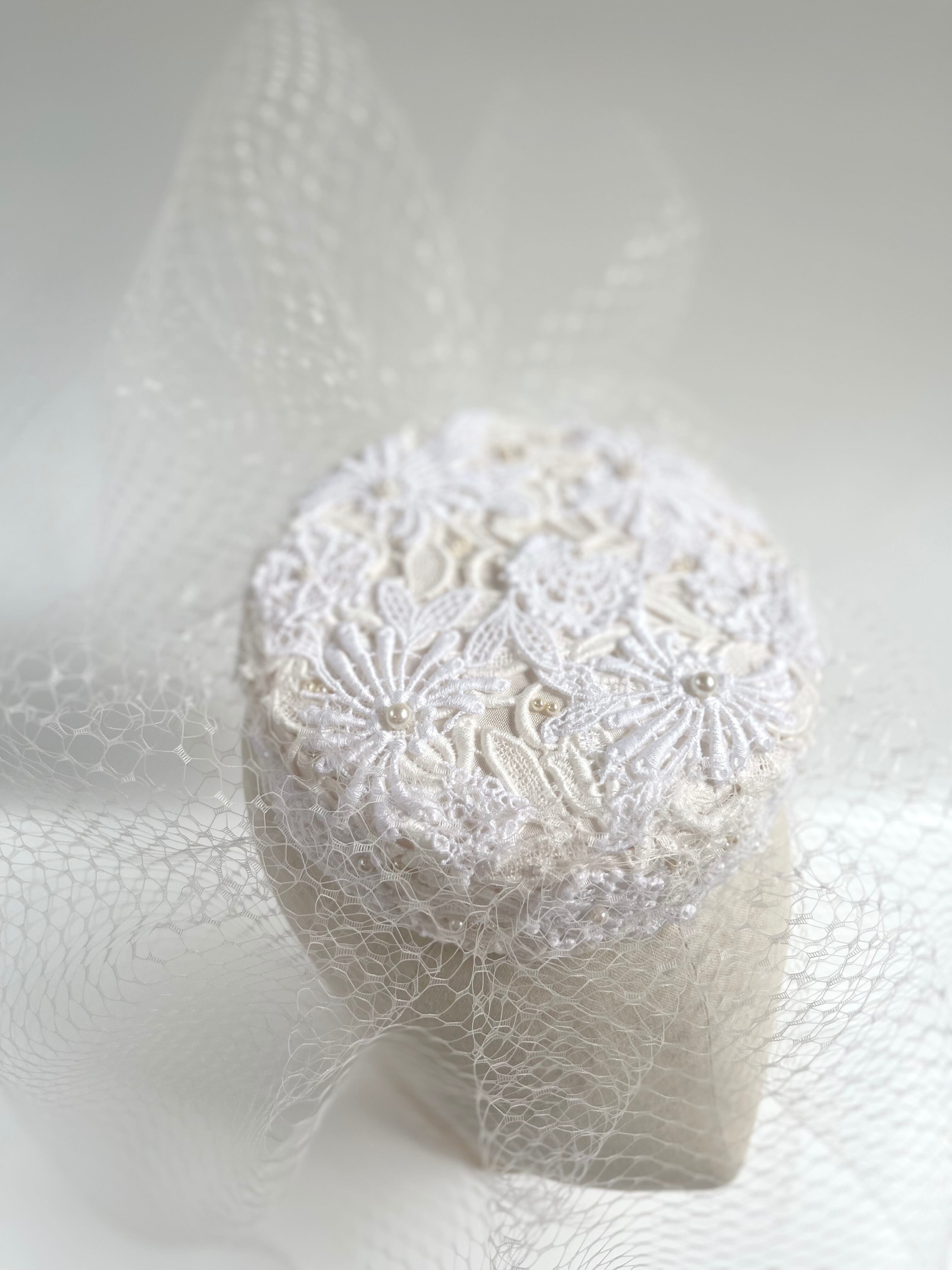 美しいチューリップレースを使用したこのトーク帽は、ウエディングのヘッドドレスとして最適で、特別な日をさらに華やかに演出します。軽やかなチュールは、まさにフェイスベールのように、顔周りを繊細に飾り、上品な雰囲気を与えます。