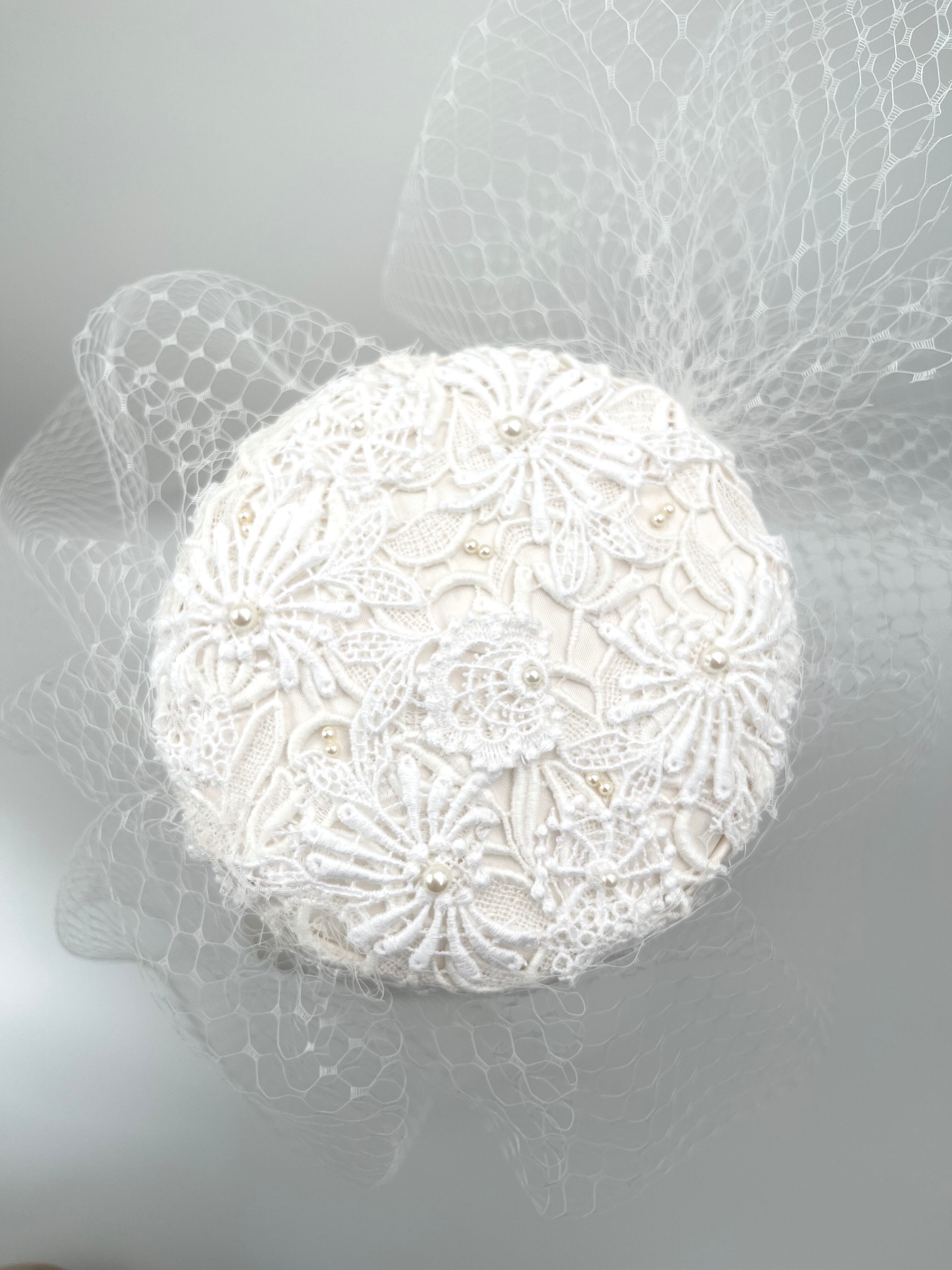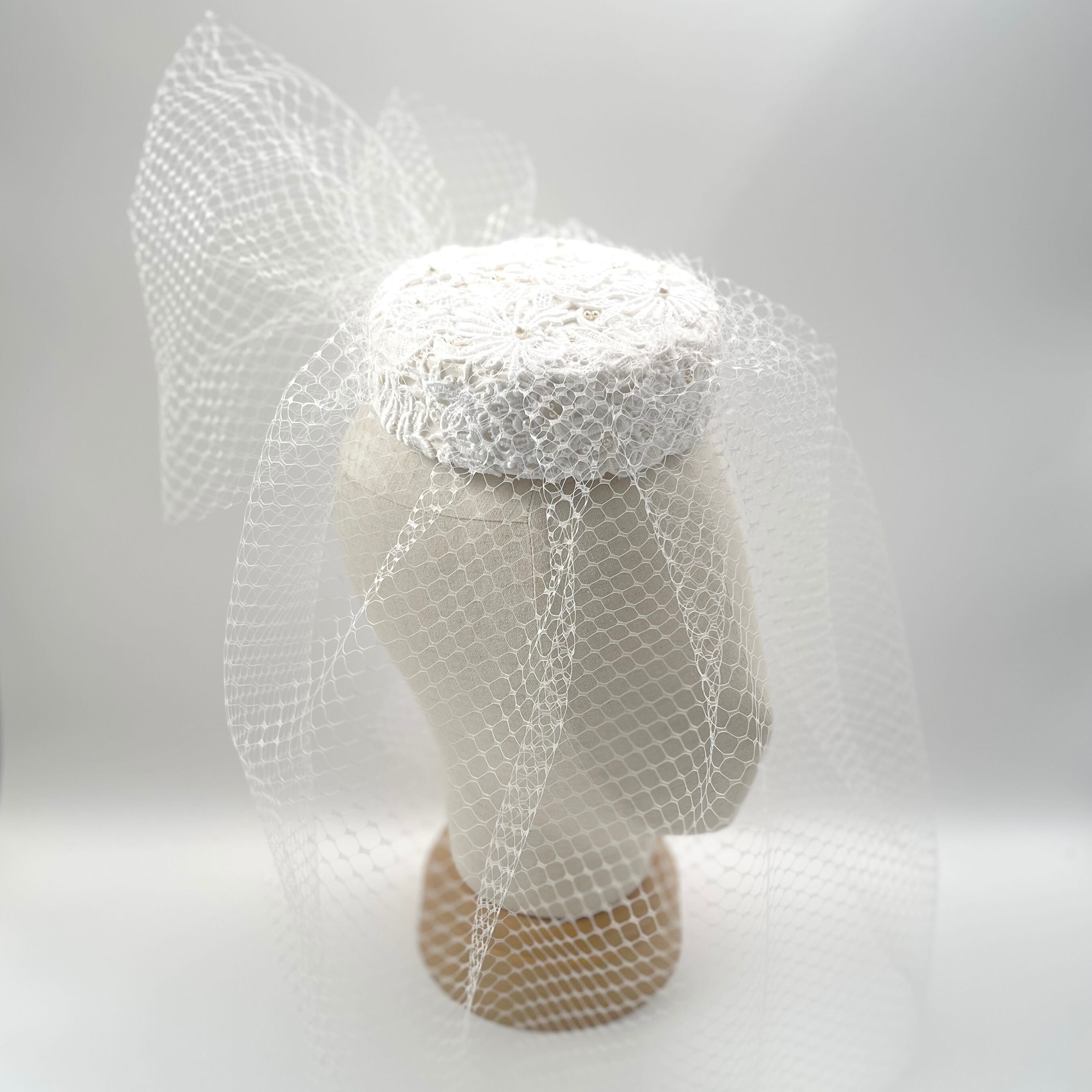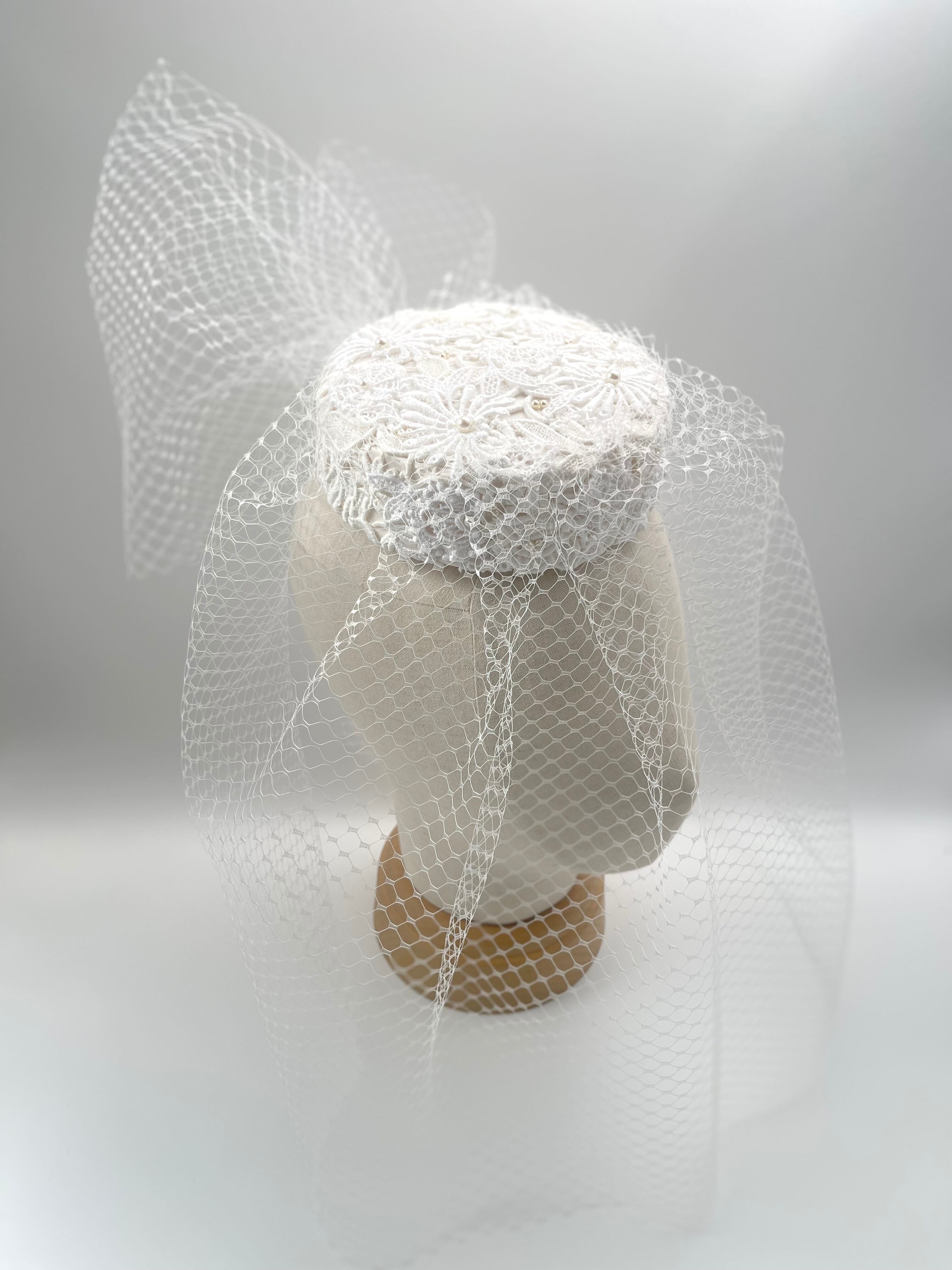 美しいチューリップレースを使用したこのトーク帽は、ウエディングのヘッドドレスとして最適で、特別な日をさらに華やかに演出します。軽やかなチュールは、まさにフェイスベールのように、顔周りを繊細に飾り、上品な雰囲気を与えます。