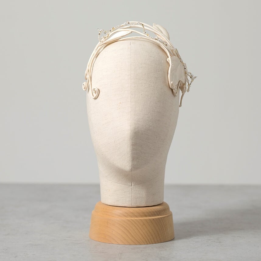 蔦のボンネはシルクタフタのドレス素材を使って芯にワイヤーを入れヘッドの形に添わせることができます。リーフのモチーフとビーズのアレンジで華やかでナチュラルダウンから流行りのゆるいヘアーに添わせることができます。大きさも調整しやすく使いやすいです。