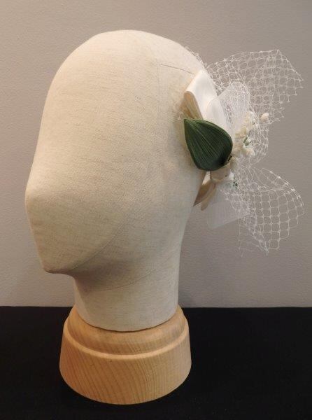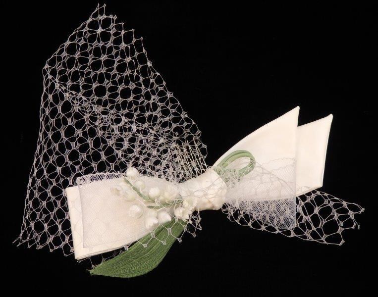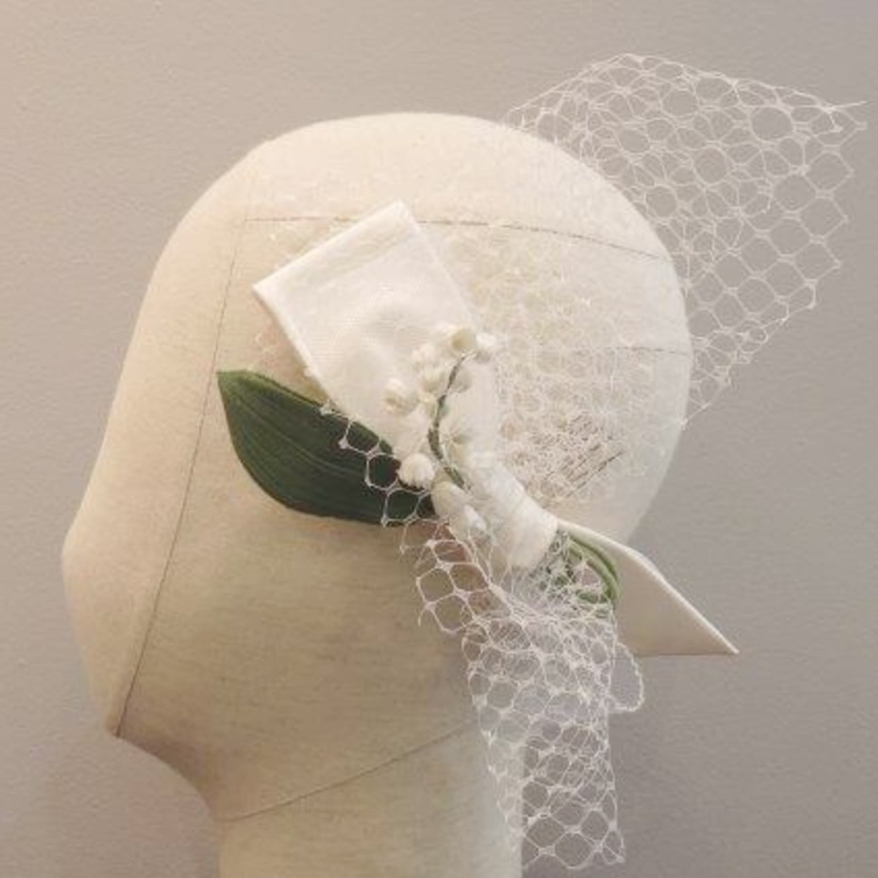アートフラワーのすずらんをリボンとハットチュールと一緒に束ねたヘッドドレス
